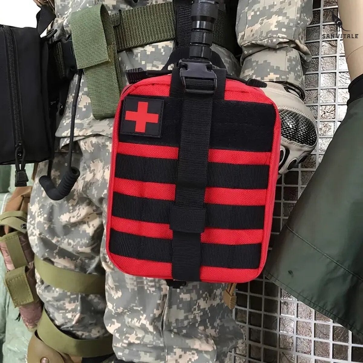 Het pakket bestaat uit vele verschillende handige benodigdheden vanhoogwaardig materiaal. Ook voor een fietstocht is de tas zeer geschikt wegens deverschillende bevestigingsmogelijkhedenen gemakkelijk aan een stuur of stang te bevestigen is. Met deze kit ga je goed voorbereid op weg en ben je gereed voor een onverwachte situatie onderweg en/of in de natuur, doordat de kit uitgerust is met eennooddeken, diverse EHBO artikelen en andere benodigdheden. Wil je genieten van een zorgeloze vakantie op de camping, dan voorziet het pakket handig in eenzakmes en zaklampen andere benodigdheden die goed van pas kunnen komen. De inhoud van deze Survival kit bestaat onder andere uit: - Zaklamp - Zakmes - Vuursteen - Schaartje - EHBO nooddeken