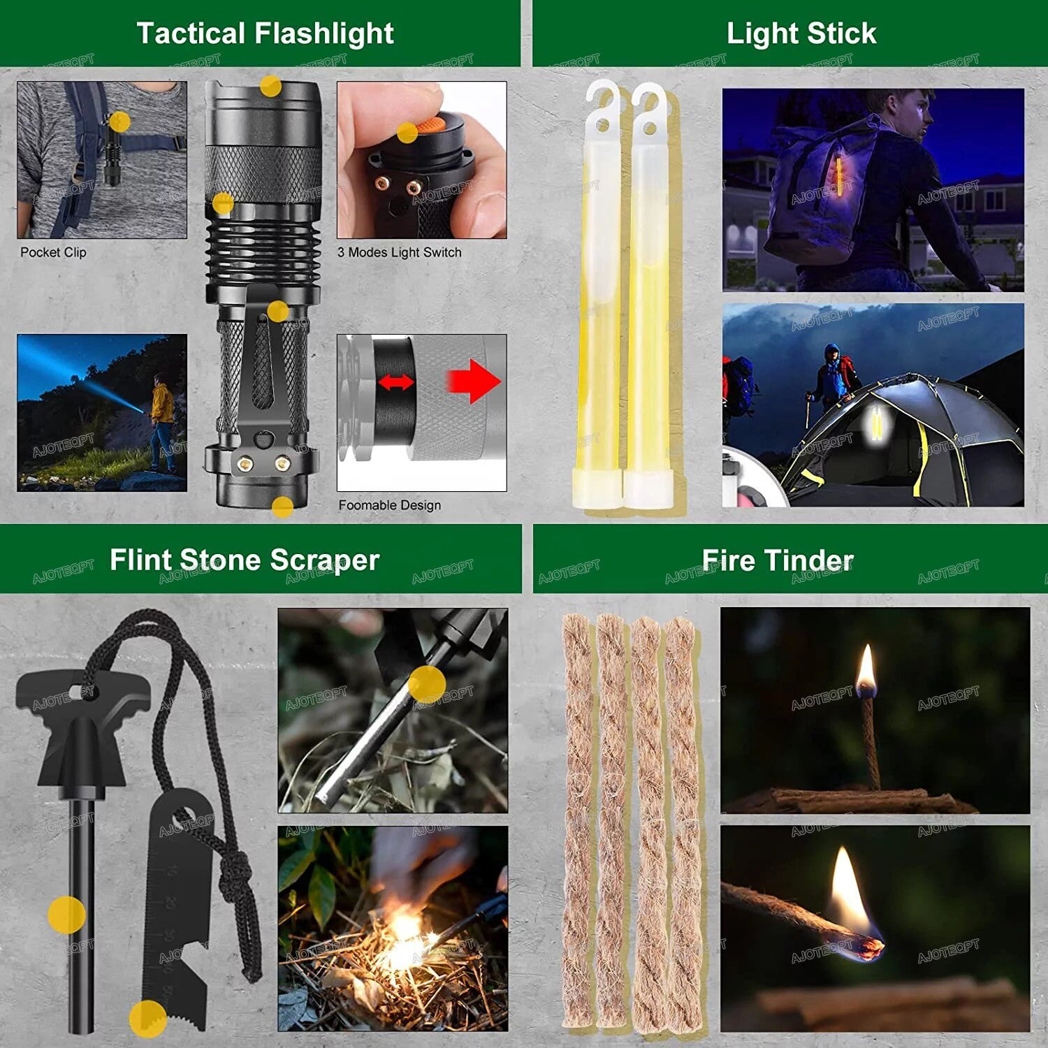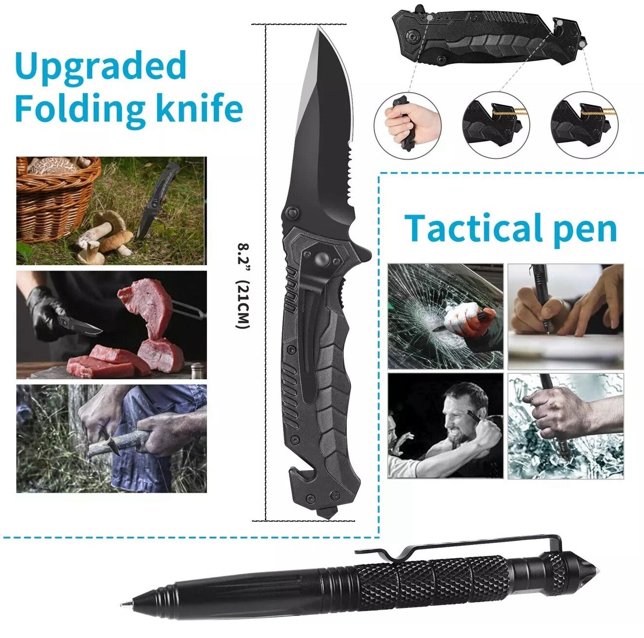 Survival kit met een handige 14 in 1 Multi-Tool, Paracord armband, Zakmes, zaklamp, vuurstarter kit, kompas en nog veel meer! Handig voor op de camping, voor op avontuur of als je er gewoon lekker op uit trekt in de natuur. Met deze Survival Kit kom je niets te kort.
