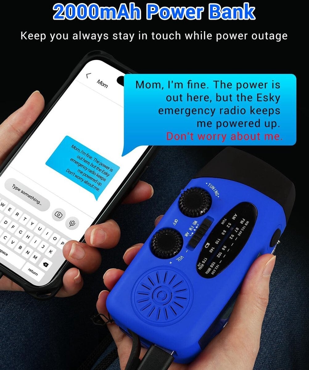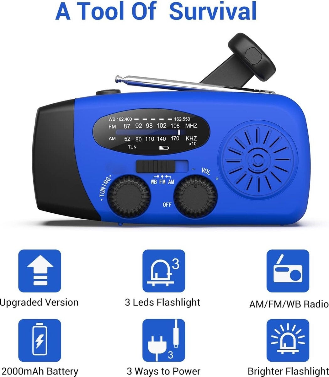 Draagbare noodradio Blauw.Deze noodradio is een alles in 1 draagbare radio met meerdere, praktische functionaliteiten. De radio kan namelijk ook als zaklamp of powerbank gebruikt worden. De draagbare radio kan op 3 manieren opgeladen worden: op zonne-energie, zelf opwinden of met de meegeleverde USB-kabel. Met de radio kun je zowel AM als FM radiozenders ontvangen. De AM range loopt van 520 tot tot 1600 KHz en de FM range loopt van 87 tot 108 MHz. Gebruikt de radio gemakkelijk als powerbank dankzij de meegeleverde USB-C kabel. Met een vermogen van 2000 mAh is jouw telefoon zo weer opgeladen! Ook kun je de kabel gebruiken om de radio gemakkelijk op te laden. Ideaal is de ingebouwde zaklamp. Handig als het donker begint te worden en je bent nog onderweg of als je iets kwijt bent. De radio heeft een IPX3 codering en is dus spatwaterdicht. Je kunt hem dus in alle weersomstandigheden gebruiken. Ook is de radio niet groter dan een Smartphone en kun je hem gemakkelijk overal mee naartoe nemen. Een handig apparaat voor als je gaat kamperen, wandelen, als je op reis bent, maar ook voor echte noodsituaties! Specificaties: