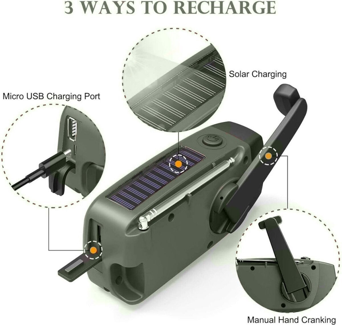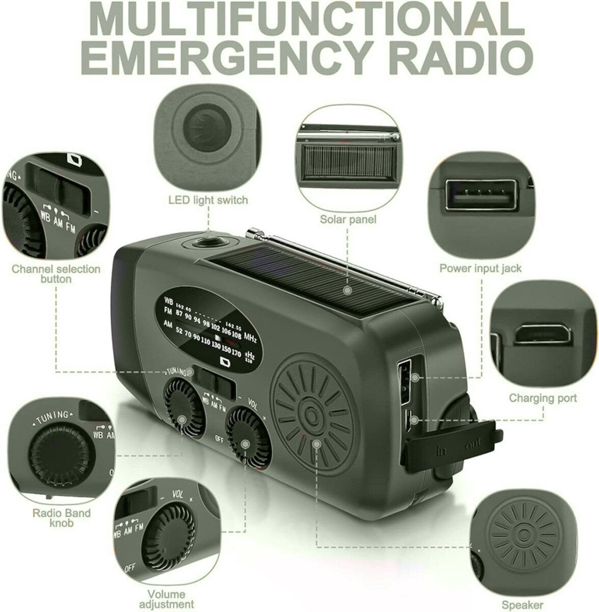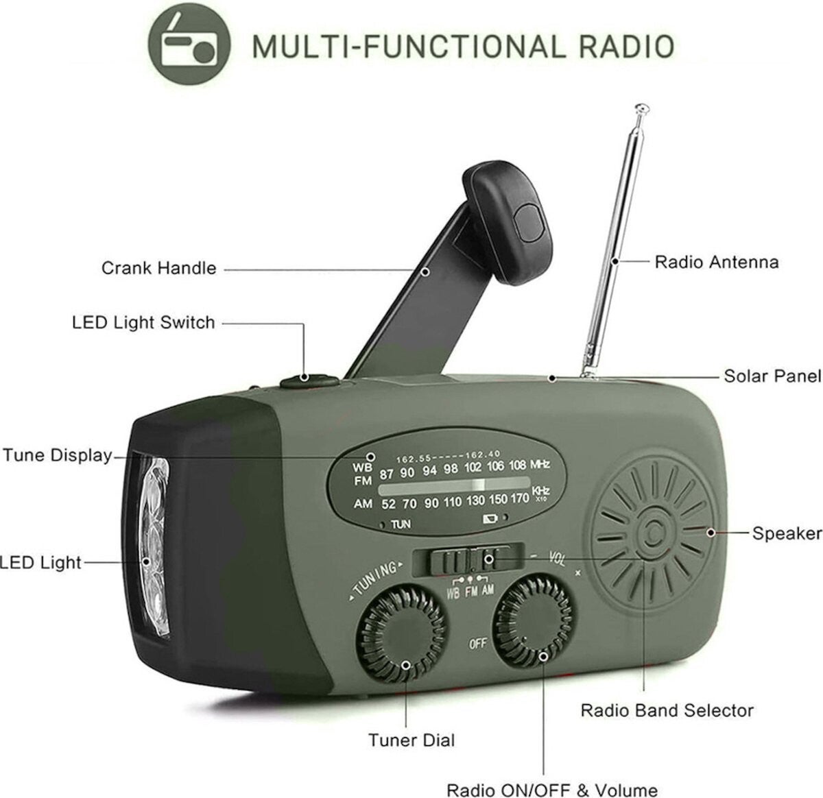 Draagbare noodradio Groen Deze noodradio is een alles in 1 draagbare radio met meerdere, praktische functionaliteiten. De radio kan namelijk ook als zaklamp of powerbank gebruikt worden. De draagbare radio kan op 3 manieren opgeladen worden: op zonne-energie, zelf opwinden of met de meegeleverde USB-kabel. Met de radio kun je zowel AM als FM radiozenders ontvangen. De AM range loopt van 520 tot tot 1600 KHz en de FM range loopt van 87 tot 108 MHz. Gebruikt de radio gemakkelijk als powerbank dankzij de meegeleverde USB-C kabel. Met een vermogen van 2000 mAh is jouw telefoon zo weer opgeladen! Ook kun je de kabel gebruiken om de radio gemakkelijk op te laden. Ideaal is de ingebouwde zaklamp. Handig als het donker begint te worden en je bent nog onderweg of als je iets kwijt bent. De radio heeft een IPX3 codering en is dus spatwaterdicht. Je kunt hem dus in alle weersomstandigheden gebruiken. Ook is de radio niet groter dan een Smartphone en kun je hem gemakkelijk overal mee naartoe nemen. Een handig apparaat voor als je gaat kamperen, wandelen, als je op reis bent, maar ook voor echte noodsituaties! Specificaties: