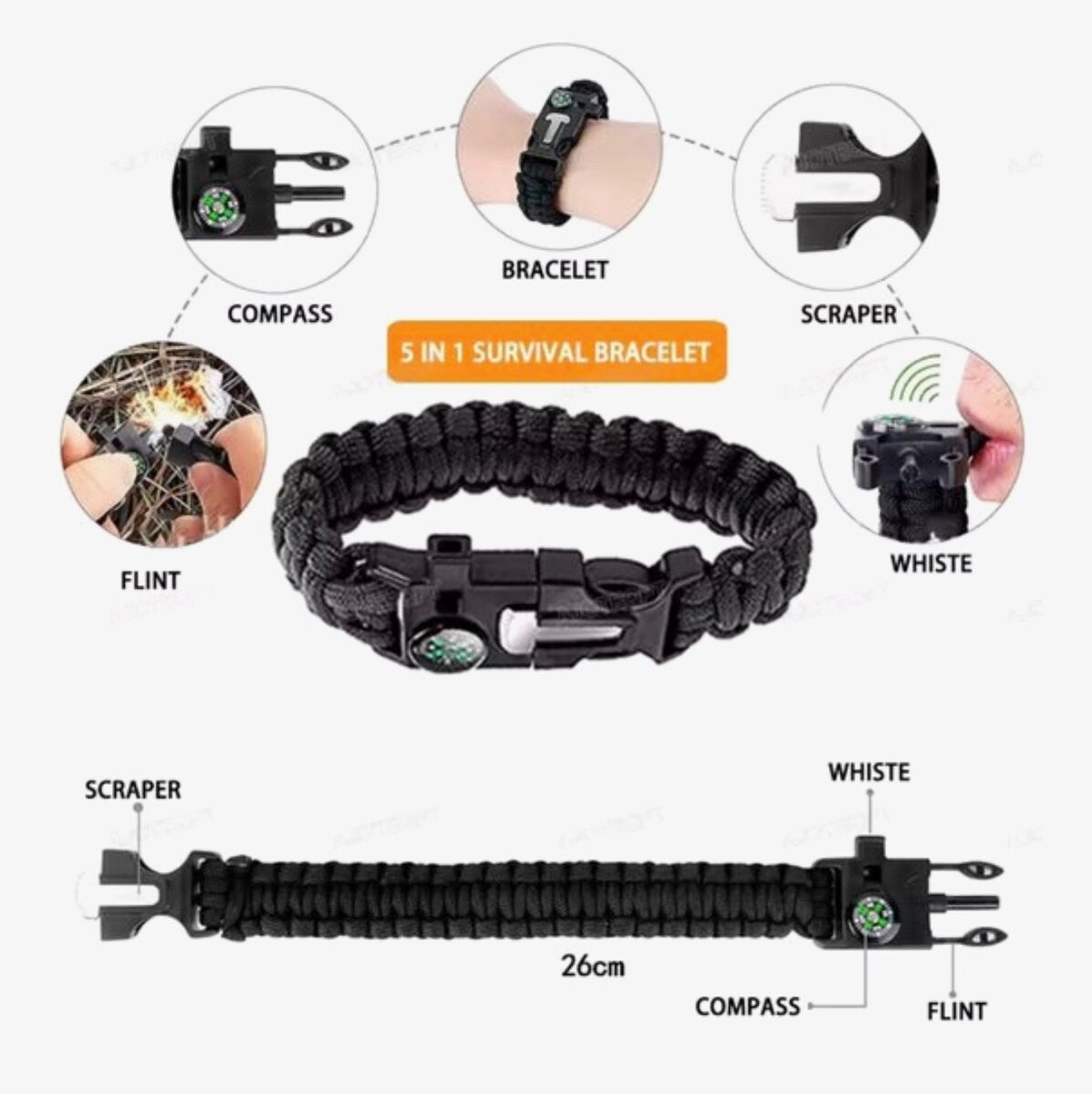 - Paracord armband (met vuursteen, fluitje en kompas)