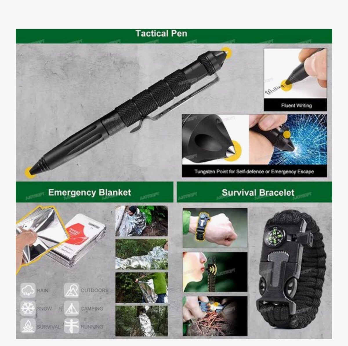 Ga goed voorbereid op pad met de uitgebreide Survival & Outdoor Combinatie Set. Deze hoogwaardige set is speciaal samengesteld voor avonturiers, kampeerders en outdoorliefhebbers. Of je nu gaat hiken in de bergen, survivallen in de natuur of gewoon veilig wilt reizen, met deze set ben je op alles voorbereid.